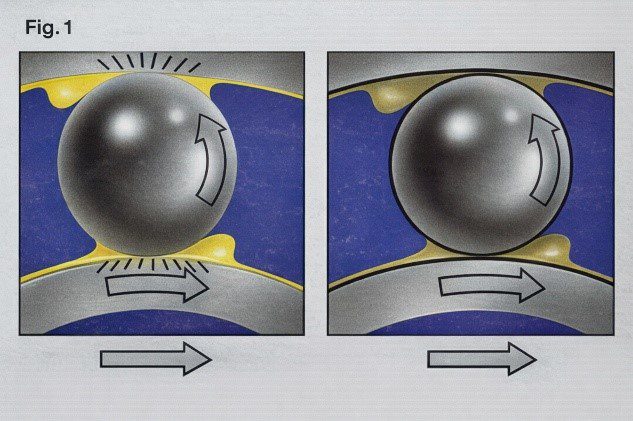 ภาพแผนภาพด้านซ้ายแสดงให้เห็นว่า เมื่อเกิด แรงกระแทก จาระบีแบบทั่วไปจะถูกบีบไล่ออกจากช่องว่างระหว่างผิวโลหะ ส่งผลให้อายุของตลับลูกปืนลดลง