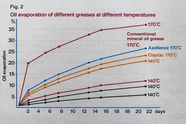 กราฟนี้แสดงให้เห็นว่า จาระบีสมรรถนะสูงให้ผลดีกว่าจาระบีทั่วไป โดยเฉพาะที่อุณหภูมิสูง ยิ่งอัตราการระเหยต่ำเท่าใด ช่วงเวลาระหว่างการเติมสารหล่อลื่นซ้ำก็ยิ่งยาวนานขึ้นเท่านั้น